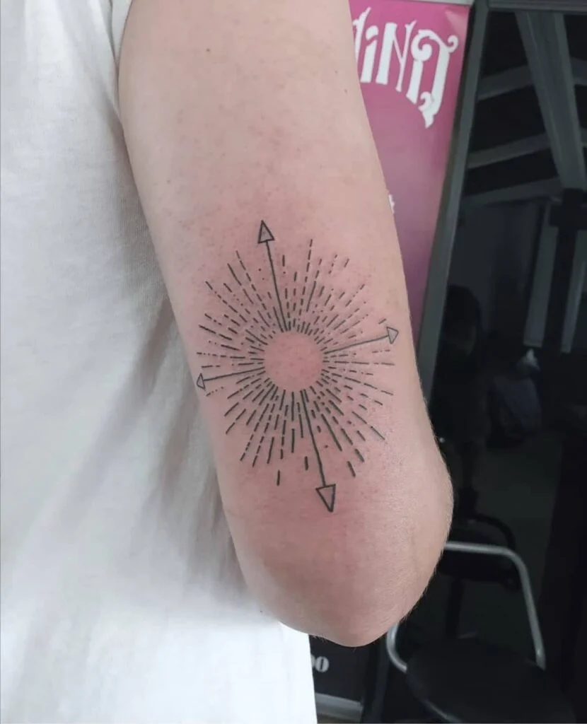 This tattoo features a clean and minimalistic sun design, radiating straight rays with arrowheads pointing outward. Placed near the elbow, it combines sharp lines and symmetry, creating a balance between modern geometry and natural inspiration. The arrows symbolize direction and movement, guiding the wearer toward growth and clarity.