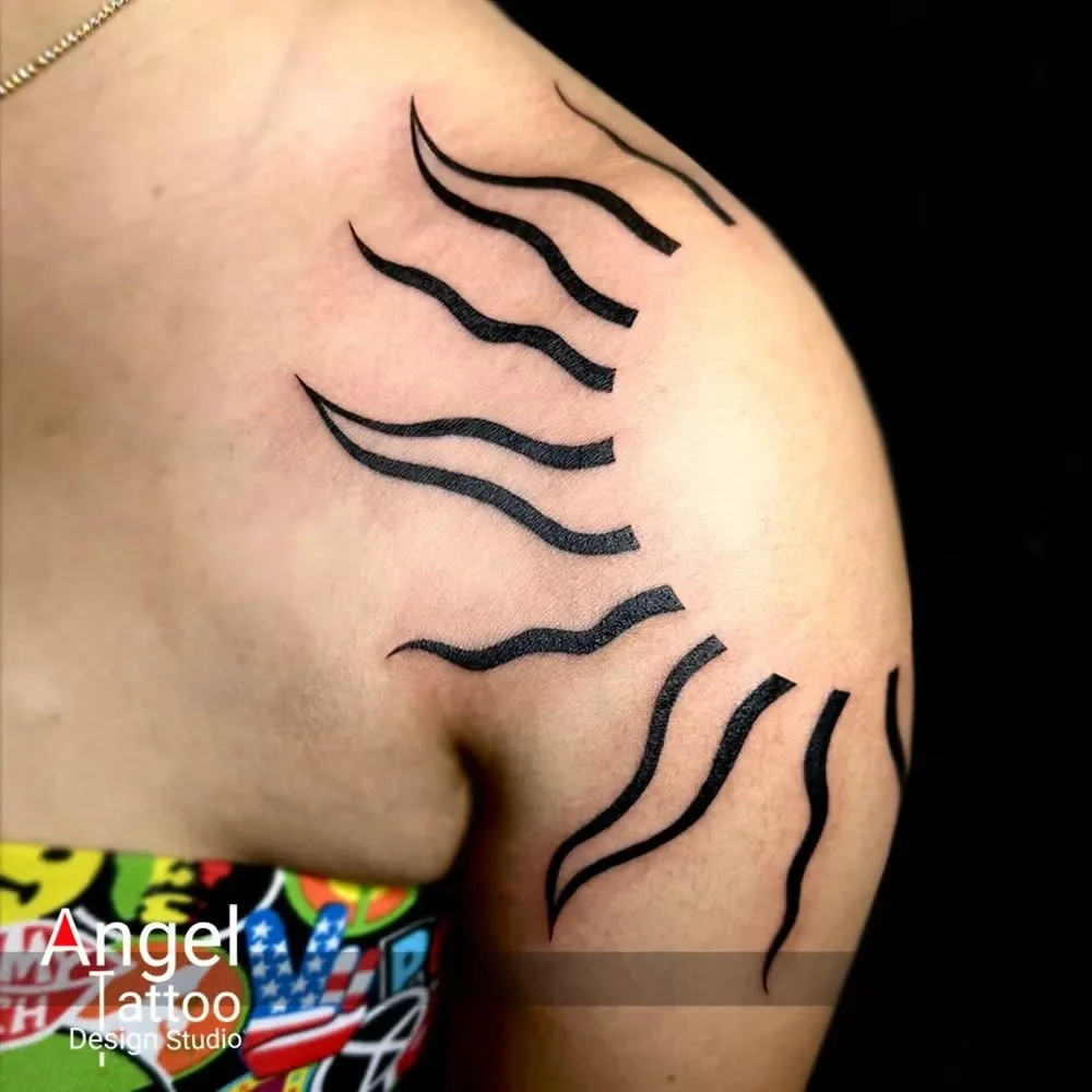 This tattoo takes a modern approach, with bold, wavy black lines extending outward to resemble sun rays. Flowing across the shoulder, the design uses sharp contrast and negative space to create movement, almost like flames radiating from the body. It’s an edgy interpretation of sunlight’s energy.