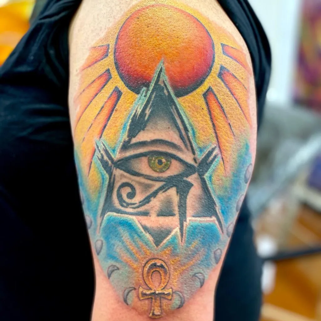 This bold and colorful tattoo merges mystical symbolism with radiant sun energy. The Eye of Providence sits within a triangle, surrounded by glowing orange rays and an illuminated sky. Below, the Ankh and lunar phases add depth, weaving together themes of spirituality, eternity, and cosmic balance.