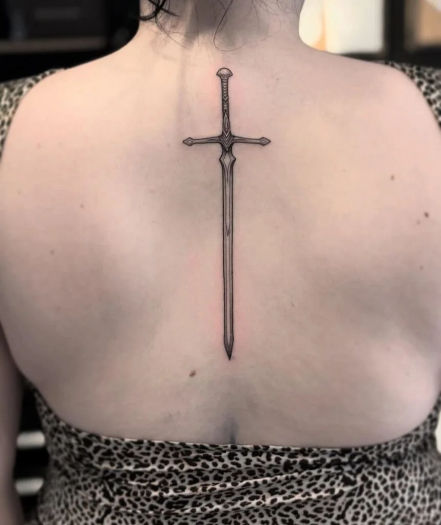 This bold tattoo features a long, finely detailed sword extending vertically down the spine, emphasizing alignment, balance, and inner strength. Its placement accentuates the natural line of the body, creating an elegant and commanding visual effect.