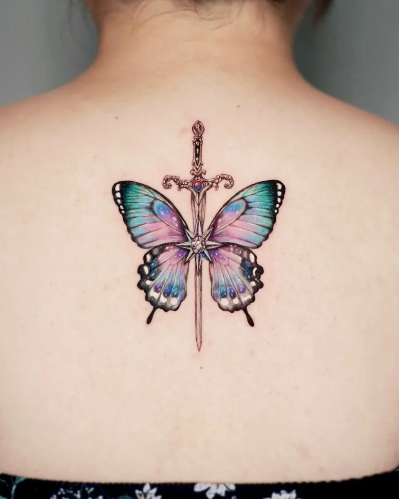This enchanting tattoo combines the image of a detailed sword with vibrant butterfly wings, blending strength and transformation into a single design. The butterfly symbolizes rebirth and beauty, while the sword represents resilience and courage.