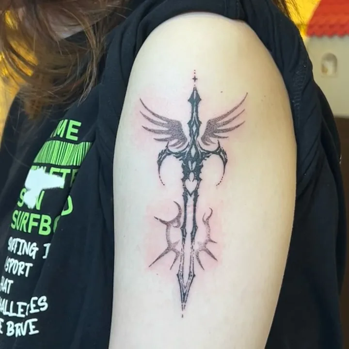 This tattoo features a gothic-inspired sword with intricate detailing and wing-like extensions at the hilt, giving it an ethereal and almost celestial presence. The wings symbolize freedom, spirituality, and ascension, while the sword represents discipline and power.