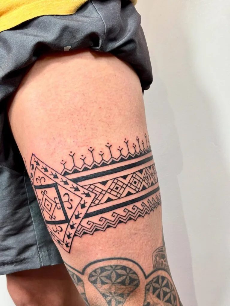This thigh tattoo highlights a detailed tribal-inspired pattern filled with lines, diamonds, and intricate geometric designs. Bold borders frame the motifs, while smaller symbols add balance and symmetry. The band’s scale and density make it a strong visual statement, emphasizing tradition and cultural heritage.