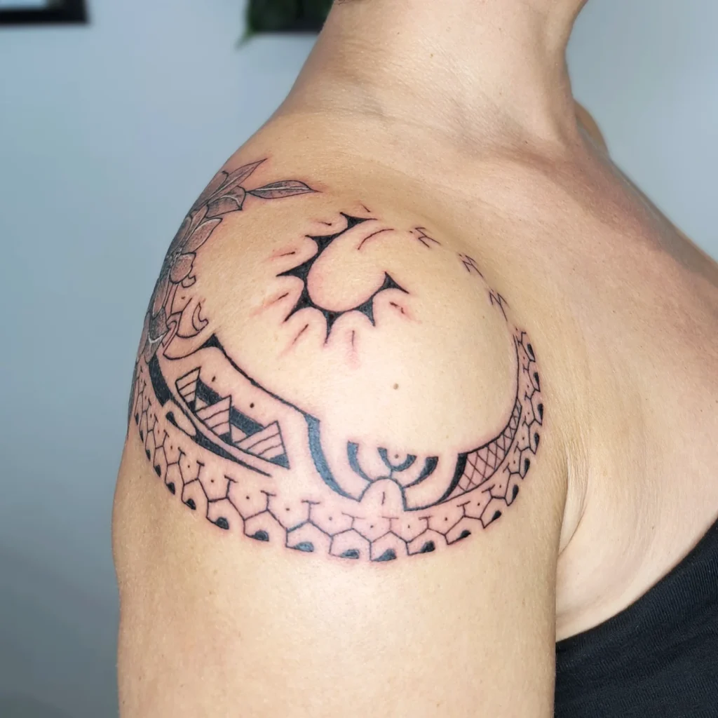 This shoulder tattoo features a circular crescent-like tribal design with geometric shapes and subtle cultural detailing. Its placement enhances the natural curve of the shoulder, making it both decorative and bold.