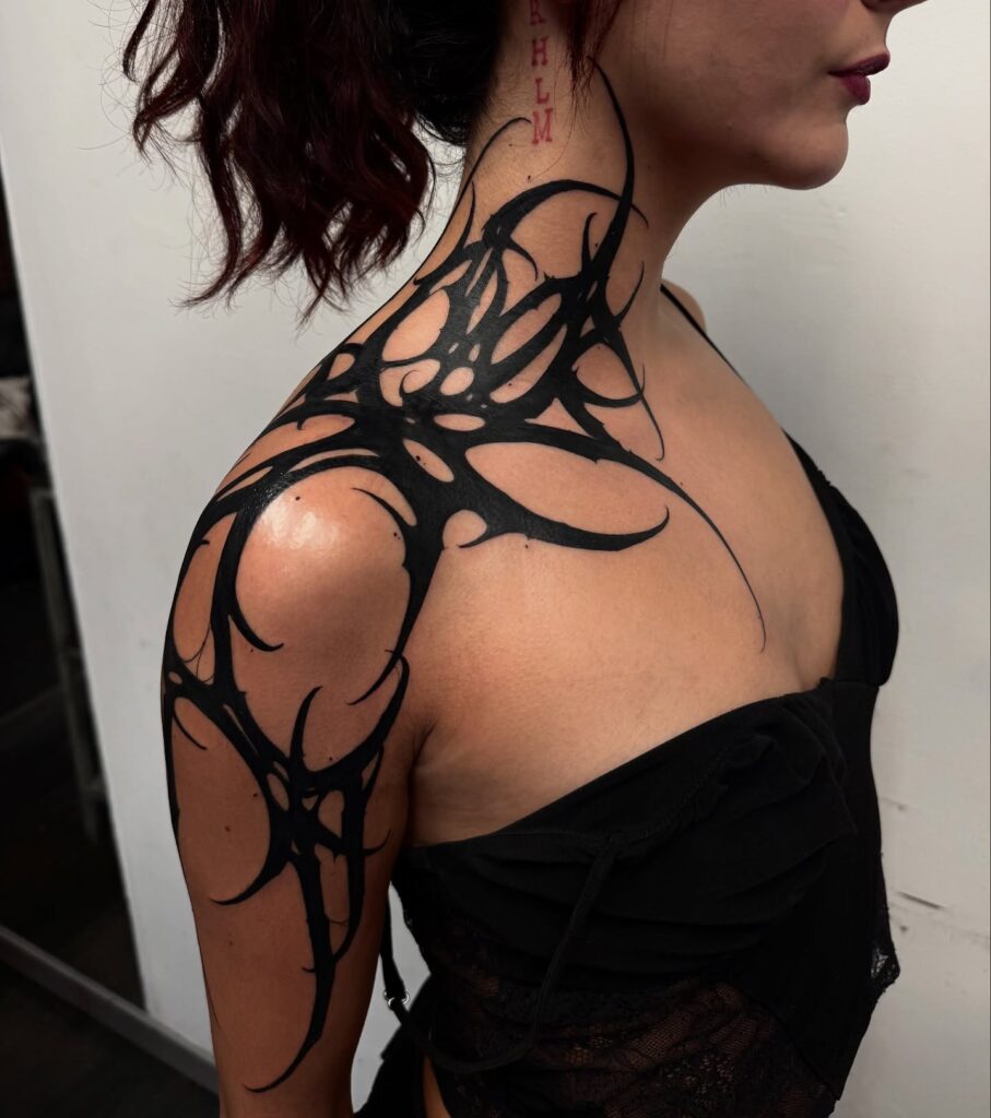 This tattoo features sweeping black ink patterns across the shoulder and collarbone, creating an abstract yet tribal-inspired design. The flowing curves radiate outward, enhancing the natural shape of the body with dramatic boldness.