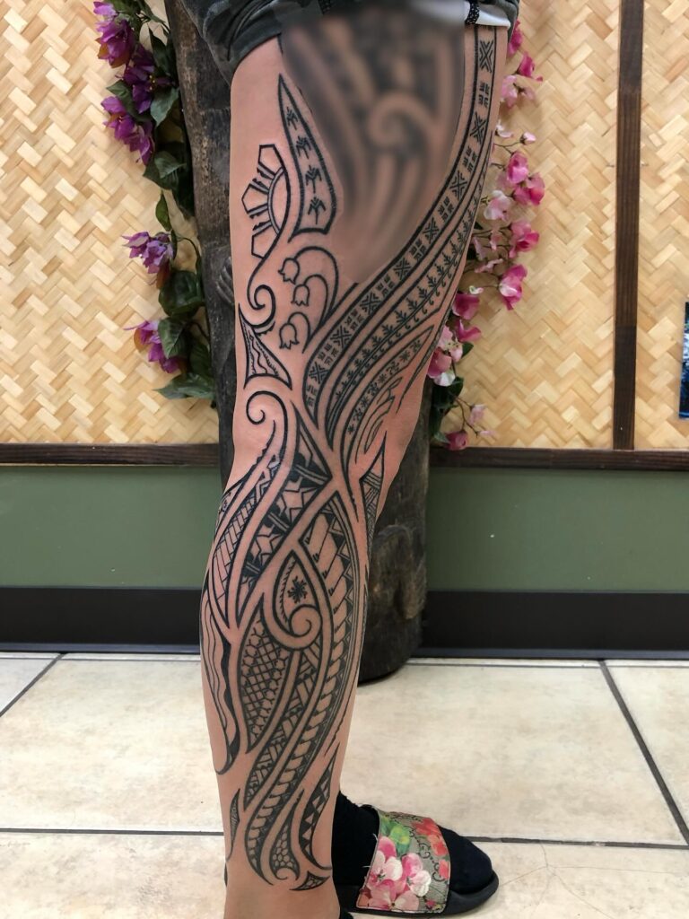 Flowing from thigh to ankle, this leg tattoo uses intricate tribal linework combined with swirls and geometric detailing. The layered patterns create depth and movement, making the design dynamic and balanced.