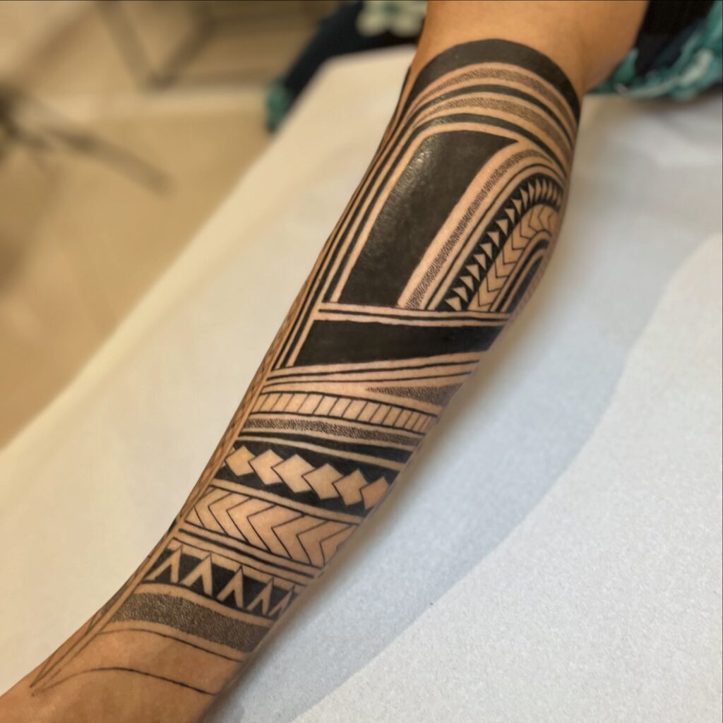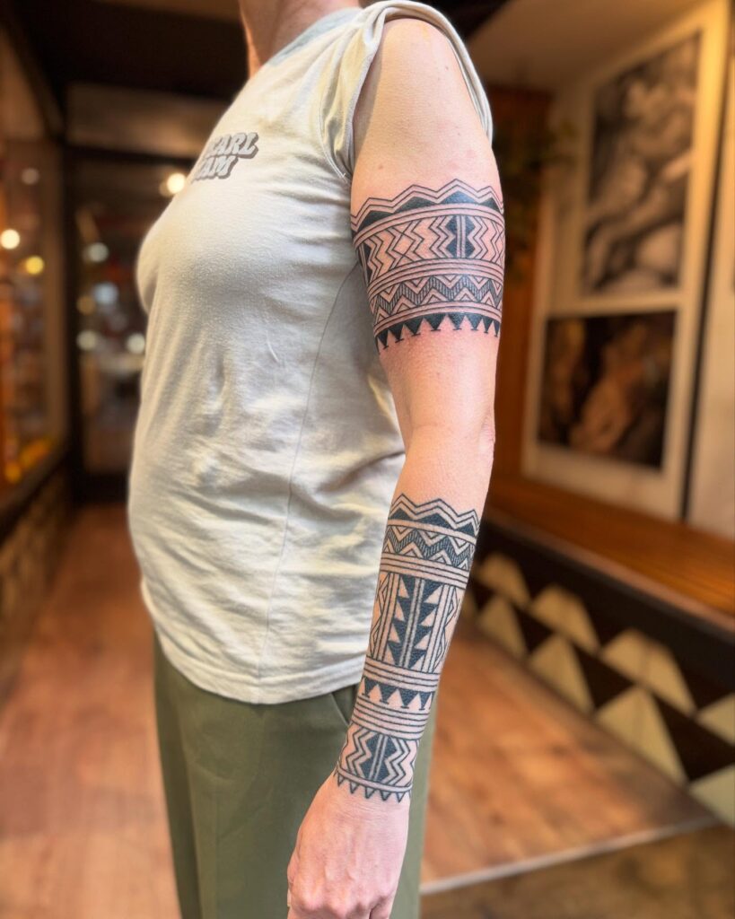 This full arm tribal tattoo wraps seamlessly around the forearm and bicep, showcasing bold black bands filled with zigzag and diamond motifs. Each pattern element is precise, echoing traditional designs that symbolize unity, protection, and power.
