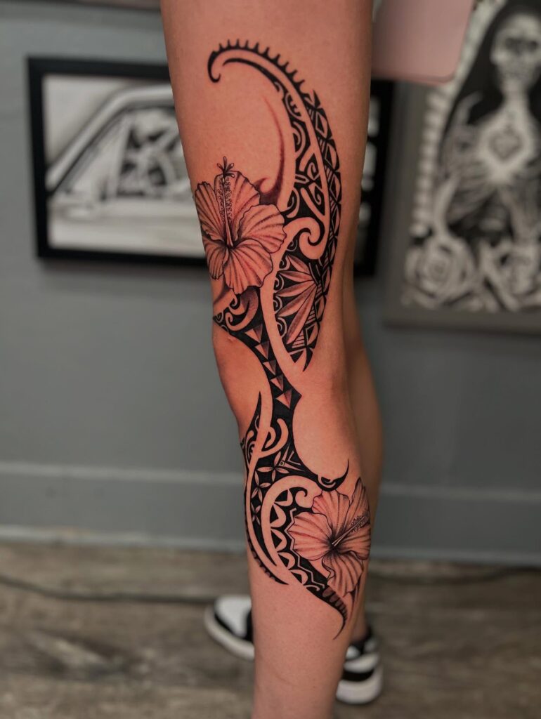 A harmonious blend of bold tribal lines and delicate hibiscus flowers defines this leg tattoo. The curved, spiraling black patterns flow naturally around the calf, while the floral details soften the design, adding elegance and balance.