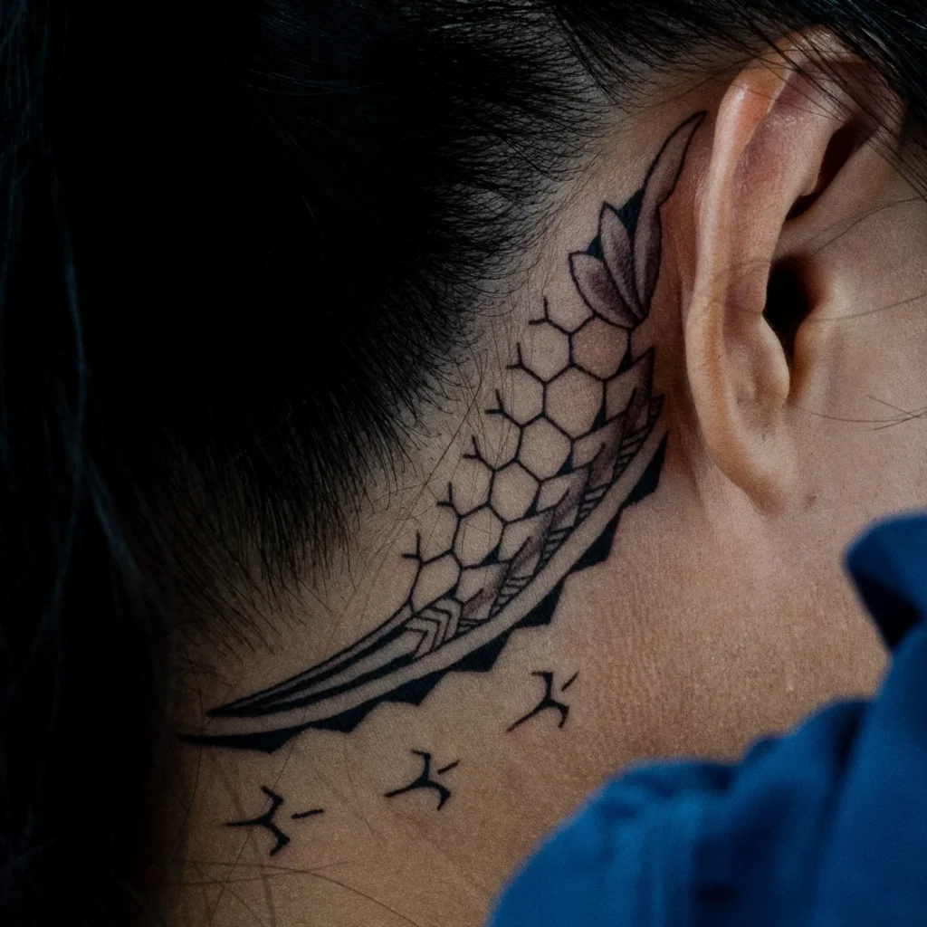 Delicately placed behind the ear, this tattoo combines honeycomb-style shapes with flowing tribal lines that taper toward the neckline. It’s subtle yet striking, designed for women who want meaningful ink in a discreet placement.