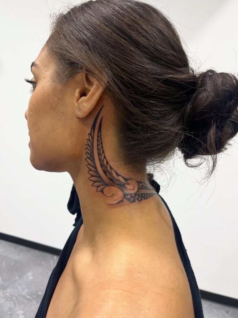 This elegant tattoo on the side of the neck resembles a wing formed with tribal patterns. Its upward flow enhances the natural lines of the body, creating a powerful yet graceful visual effect.