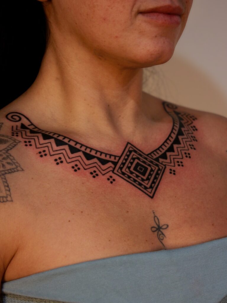 This chest tattoo mimics the look of a necklace, with bold zigzag lines and a central diamond shape extending across the collarbone. The geometric symmetry is both eye-catching and symbolic.