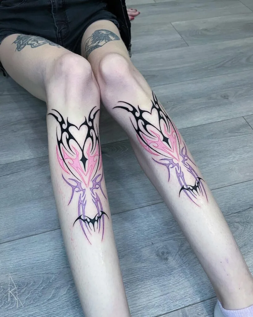 Here, the tribal design takes on a vibrant twist with the addition of soft pink and purple shading beneath sharp black flame-like outlines. Placed on the shins, the symmetrical design radiates energy and femininity, blending traditional tribal shapes with modern color highlights.