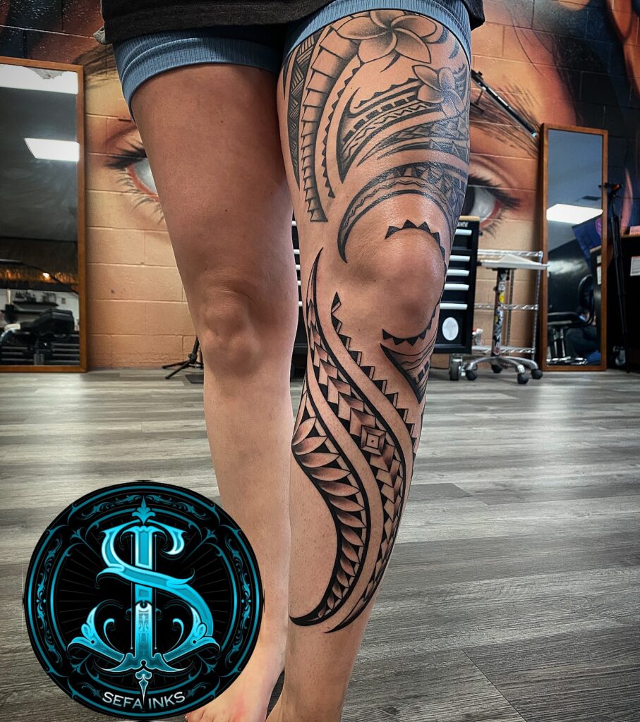 This tattoo represents endurance and cultural strength, perfectly placed on the leg to emphasize flow and elegance. Its detailed artistry ensures it stands out as both a fashion statement and a tribute to traditional symbolism. Ideal for women who want a complete, eye-catching sleeve that tells a story through its shapes.