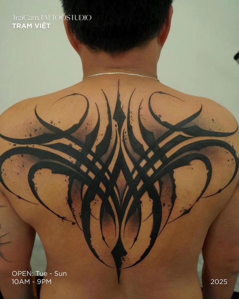 This powerful back tattoo features sweeping black arcs, spikes, and splatters, blending tribal design with abstract elements. The bold placement across the shoulders emphasizes presence and power, making it an unforgettable statement piece.
