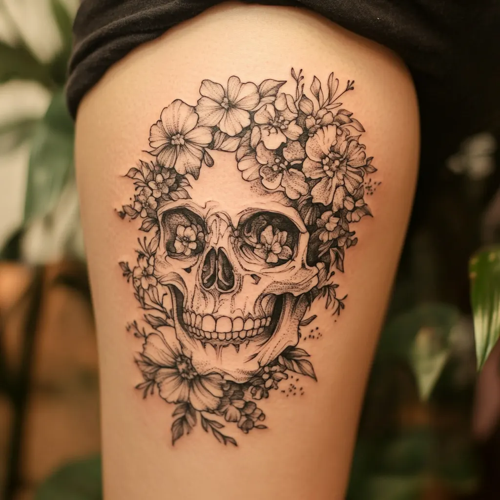 A skull and floral tattoo on the knee combines tough, rebellious imagery with soft, organic elements. The skull symbolizes mortality, defiance, or strength in the face of adversity, while the flowers represent life, growth, and renewal. This juxtaposition of contrasting themes works beautifully around the knee, adding layers of meaning to the design. The flowers can soften the skull’s harshness, making the tattoo more balanced and visually appealing. This combination is perfect for those seeking a tattoo that expresses both their resilience and their appreciation for life, capturing the delicate balance between strength and vulnerability.