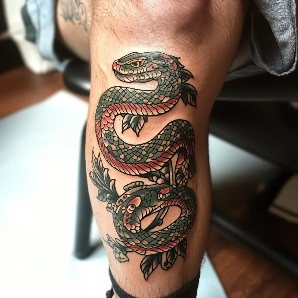 A snake tattoo coiling around the knee represents transformation, wisdom, and rebirth. Snakes are dynamic and fluid creatures, making them an ideal fit for the knee’s natural movement. The tattoo can be designed to follow the curvature of the knee, with the snake’s body wrapping around the joint and its head centered on the kneecap or just above. The snake’s slithering motion can be portrayed in fine detail or as a more stylized design, depending on your preference. This tattoo can symbolize personal growth, shedding of old habits, or the cyclical nature of life, making it a powerful statement.