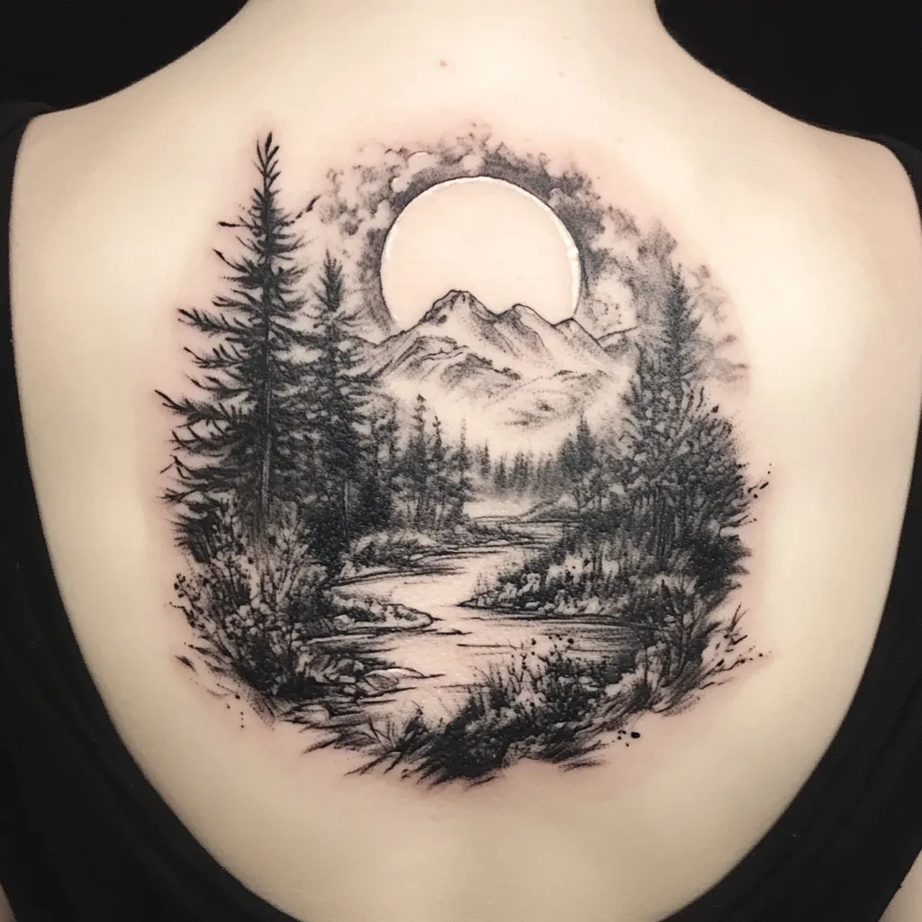 1. Moonlit Landscape Tattoo A moonlit landscape tattoo captures the quiet beauty of nighttime in the wilderness. Often featuring mountains, trees, and a glowing moon, this design represents introspection, transformation, and the connection between nature and the cosmos. Some tattoos use a full moon to signify completion and wisdom, while a crescent moon suggests renewal and growth. Adding a starry sky or water reflections enhances the tattoo’s dreamlike quality. The placement on the forearm, ribs, or back allows for a detailed and expansive design. Whether in black and grey or with soft color accents, this tattoo creates a mesmerizing visual impact.