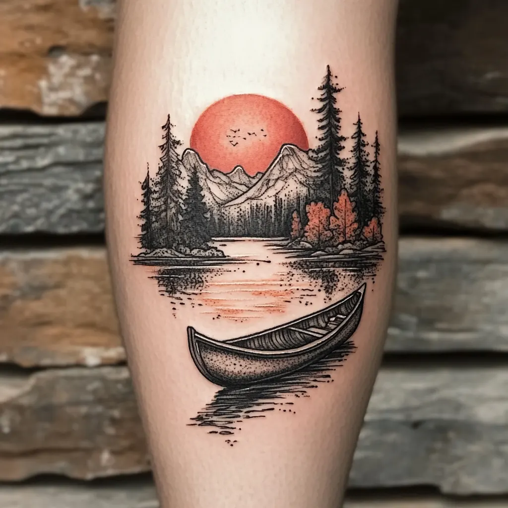 - River and Canoe Tattoo A river and canoe tattoo represents life’s journey and the ability to navigate challenges. Flowing water symbolizes adaptability, while the canoe serves as a metaphor for personal control over one’s destiny. This tattoo often includes scenic elements like trees, fish, or a sunset for added meaning. A minimalist version features sleek lines, while a detailed style brings realism to the design. Placed on the forearm, ribs, or ankle, this tattoo is perfect for adventurers who find peace in movement and exploration.