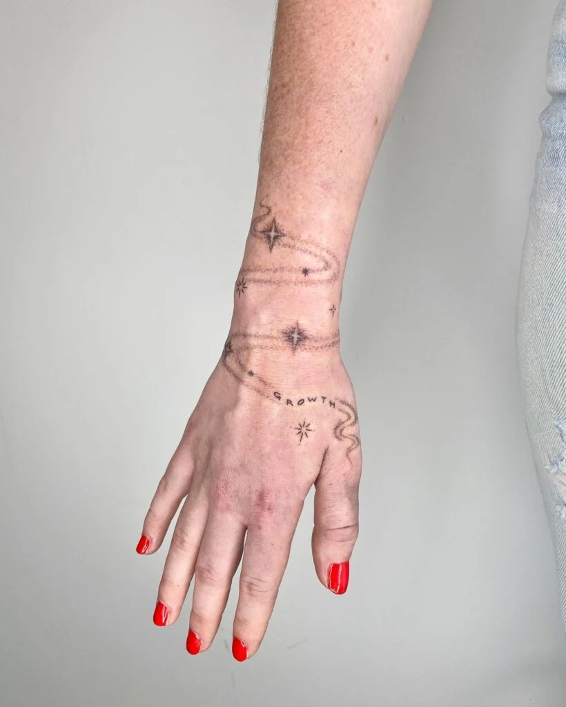 This delicate wrist wraparound tattoo embodies the beauty of personal growth and cosmic energy. The soft, fine-line design features tiny stars, swirling constellations, and the word “Growth,” symbolizing transformation and perseverance.