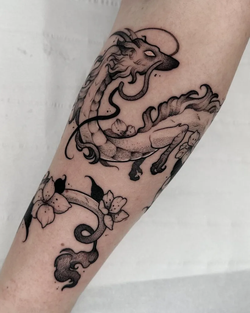 Dot work shading and bold black outlines give the tattoo a timeless aesthetic, making it an excellent choice for those who admire Asian-inspired art and legendary creatures. The dragon’s movement creates a sense of fluidity, making this tattoo a true work of body art.