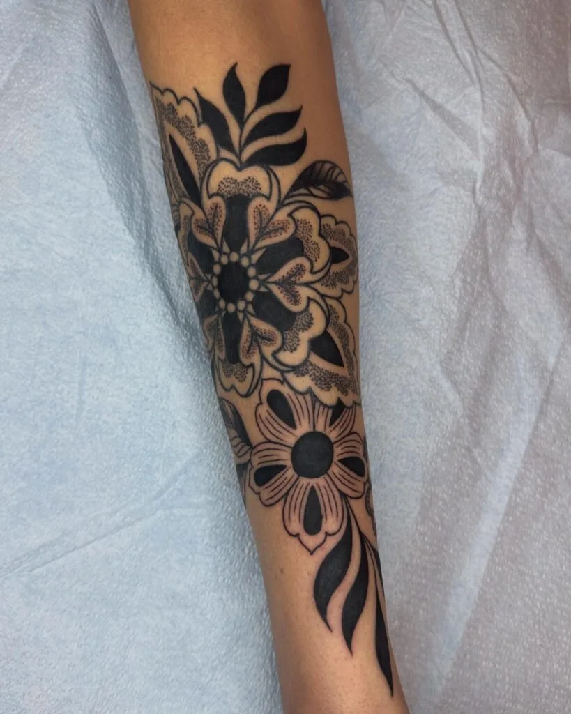 This wraparound tattoo makes a bold statement with its striking black ink floral design. Large, intricately detailed flowers and leaves extend around the forearm, creating a visually stunning effect. The use of negative space and stippling adds dimension, making the tattoo appear almost three-dimensional.