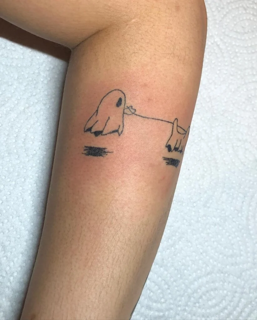 This minimalist wraparound tattoo features an adorable ghost holding onto a dog’s leash, creating a heartwarming, playful design. The simple, sketch-like line work gives the tattoo a raw and charming appeal.