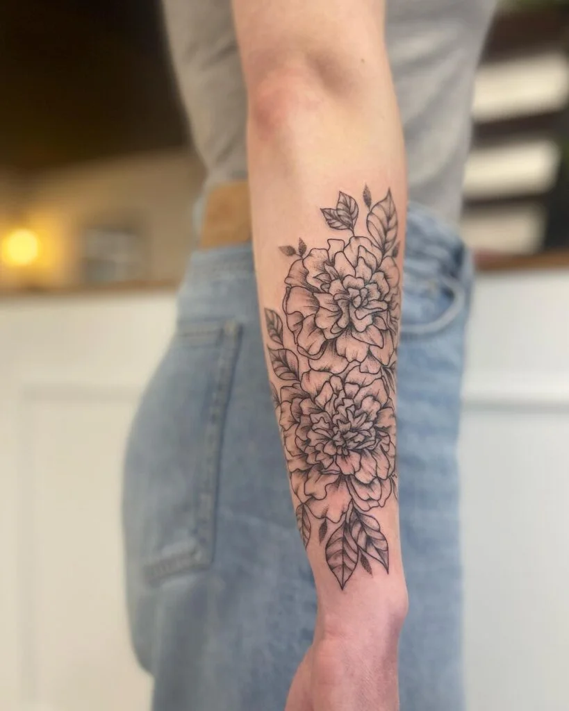 This gorgeous black and gray wraparound tattoo features a cluster of intricately detailed peonies, extending along the forearm in a stunning, organic flow. Peonies represent prosperity, beauty, and good fortune, making them a meaningful choice for body art.