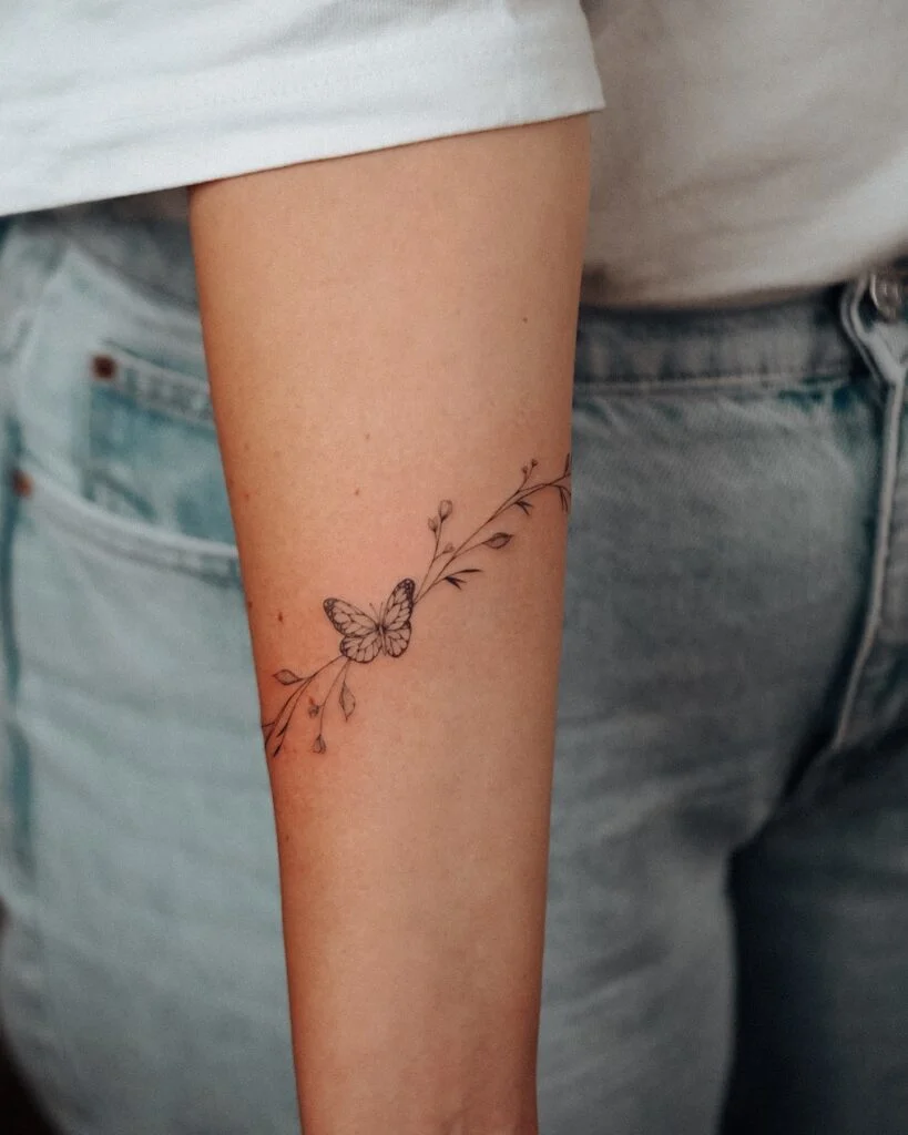 This delicate wraparound tattoo combines a single butterfly with a thin, leafy vine, creating a soft, elegant aesthetic. The fine-line details give the tattoo a minimalist charm, while the wraparound placement enhances its seamless integration with the natural contours of the arm.