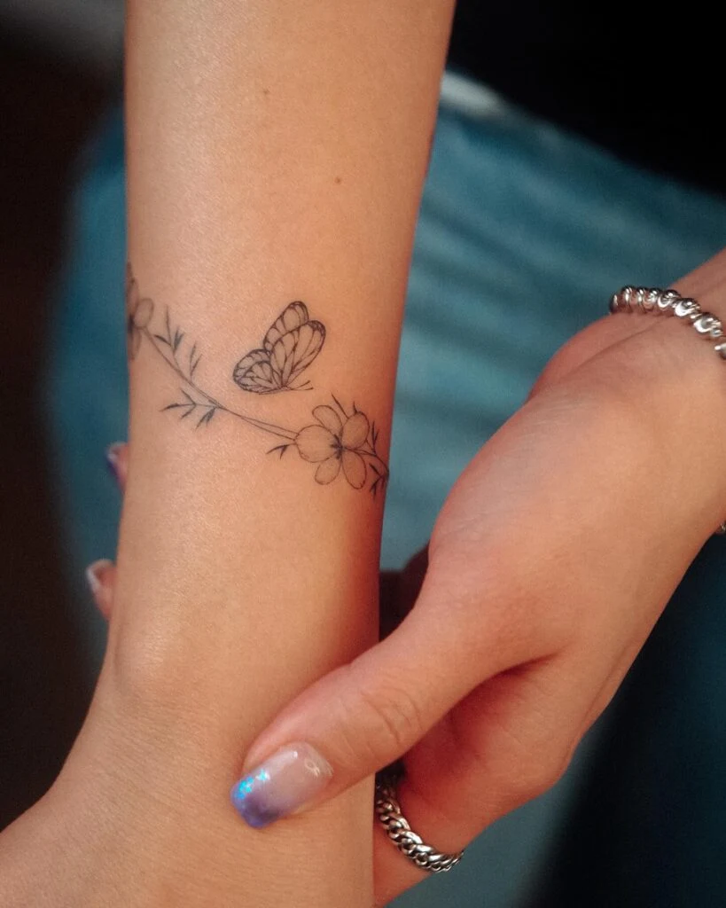 A beautifully minimalist wraparound tattoo featuring a delicate butterfly resting on a floral vine. The design wraps effortlessly around the wrist, creating an elegant and natural flow. The fine linework and subtle shading enhance the softness of the tattoo, making it a perfect choice for those who appreciate understated yet meaningful body art.