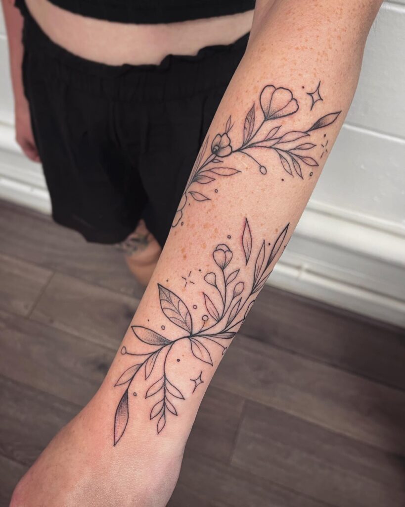A whimsical wraparound tattoo featuring fine-line floral and leafy elements intertwined with sparkling details. This delicate design wraps elegantly around the arm, giving it an enchanting bracelet-like effect. The crisp linework and graceful flow make this tattoo a perfect choice for those who appreciate minimalist yet intricate tattoos.