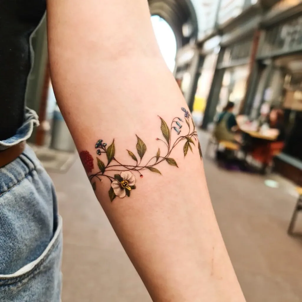 This exquisite floral wraparound tattoo features a stunning vine design, adorned with delicate flowers and intricate leaves. The design flows seamlessly around the arm, resembling a natural bracelet of botanical beauty. The soft, realistic colors give the tattoo an elegant and lifelike appearance.