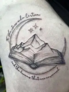 The tattoo wraps seamlessly around the wrist, enhancing its fluid and organic appearance. The design is subtle yet deeply meaningful, making it ideal for those who seek a gentle reminder of their personal journey. This tattoo’s celestial elements give it a dreamy and mystical touch, making it perfect for lovers of astrology, self-discovery, and minimalist ink.
