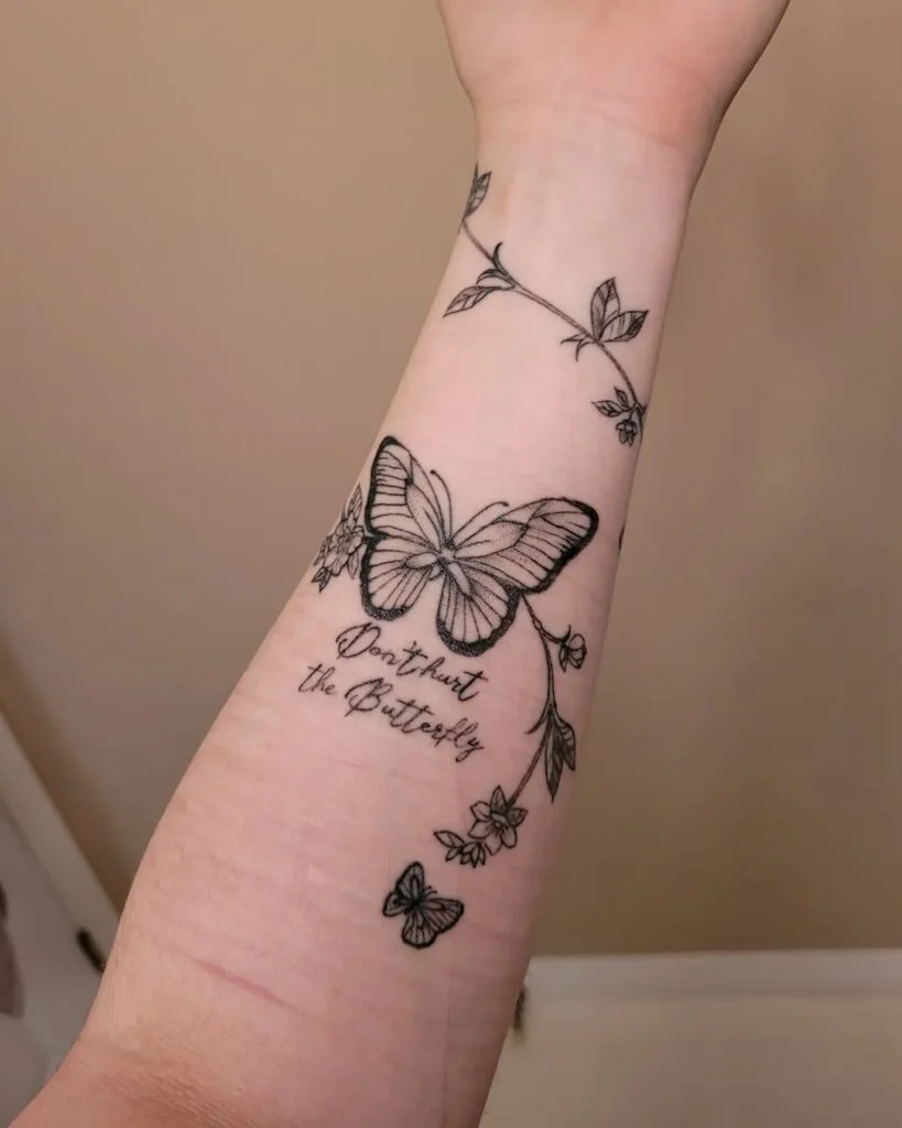 This meaningful wraparound tattoo features beautifully detailed butterflies intertwined with floral vines, symbolizing transformation and resilience. The phrase “Don’t hurt the butterfly” adds a poetic and protective message, emphasizing the importance of kindness and care.