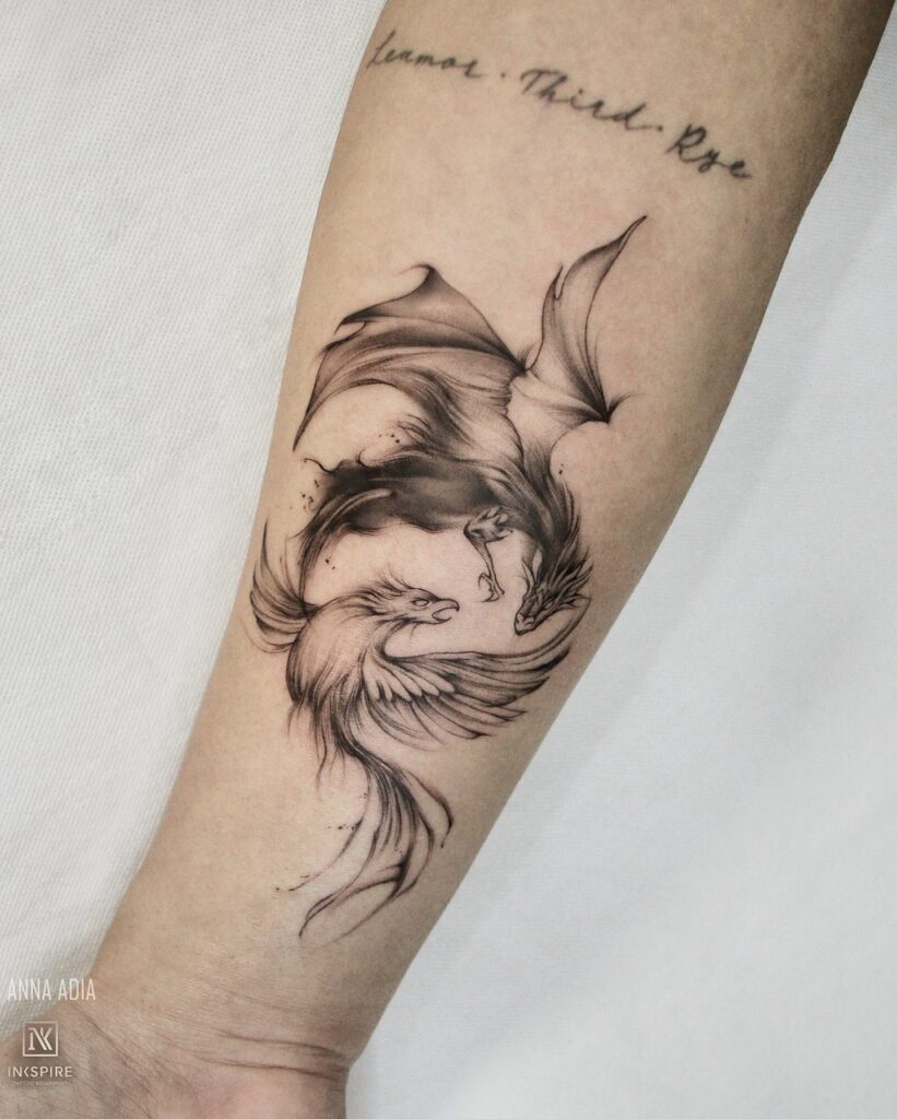 The dynamic black and gray shading makes it dramatic yet elegant. This tattoo is ideal for women who seek to embody resilience and balance, honoring both fierce determination and graceful rebirth through a mythical, powerful design.