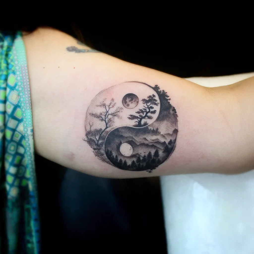 This tattoo transforms the Yin Yang into a breathtaking natural landscape, with trees, mountains, and moon phases integrated into the halves. One side reflects night, while the other reveals day, uniting opposing forces of time.