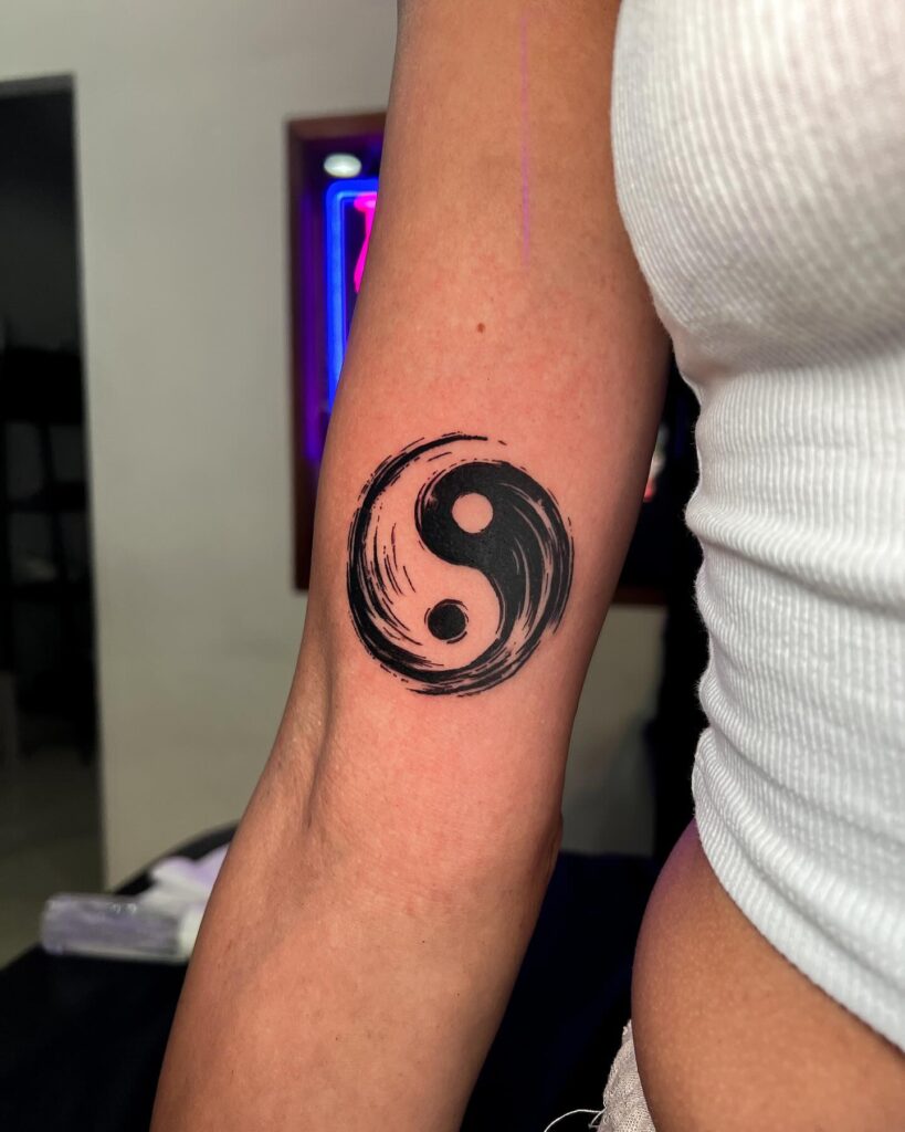 Its minimalist design makes it simple yet powerful, reminding the wearer of the beauty in simplicity and the strength in balance. Placed on the arm, it’s perfect for women who want a subtle yet meaningful tattoo that carries profound symbolism.