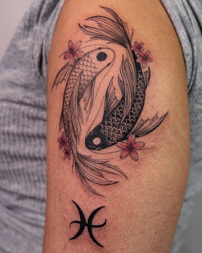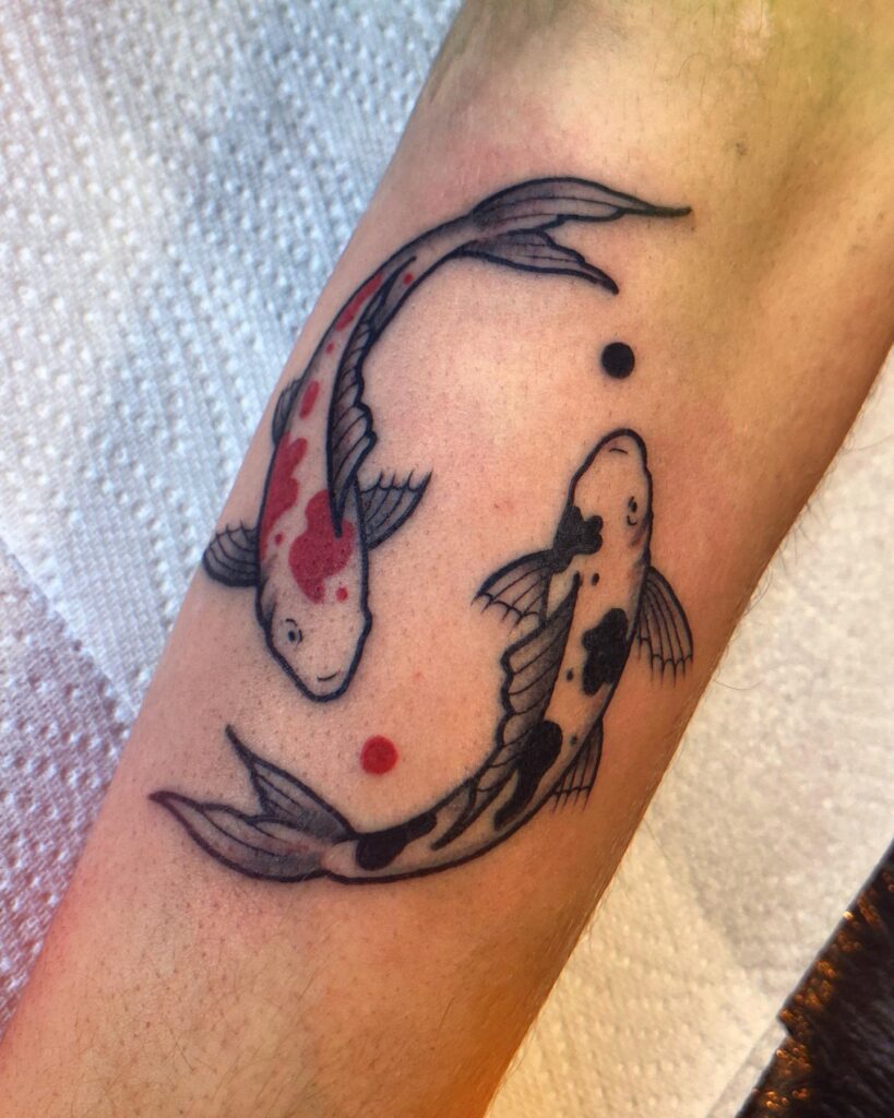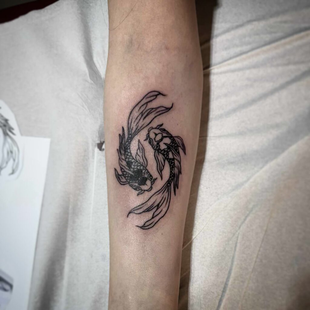 This forearm tattoo is bold and artistic, ideal for women who want to showcase harmony through detailed blackwork. It’s both timeless and elegant, merging traditional koi symbolism with the universal meaning of Yin Yang balance.