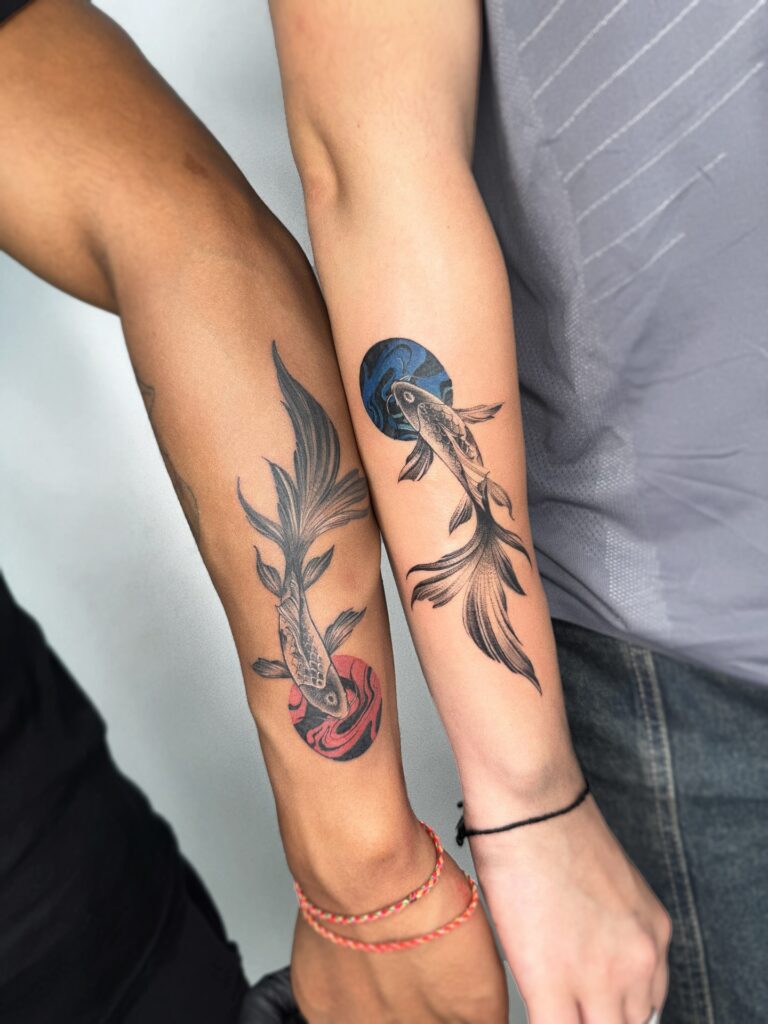 This pair of tattoos shows two koi fish positioned in Yin Yang balance, one swimming with a red circle and the other with a blue. The mirrored designs across two forearms highlight connection, unity, and duality.