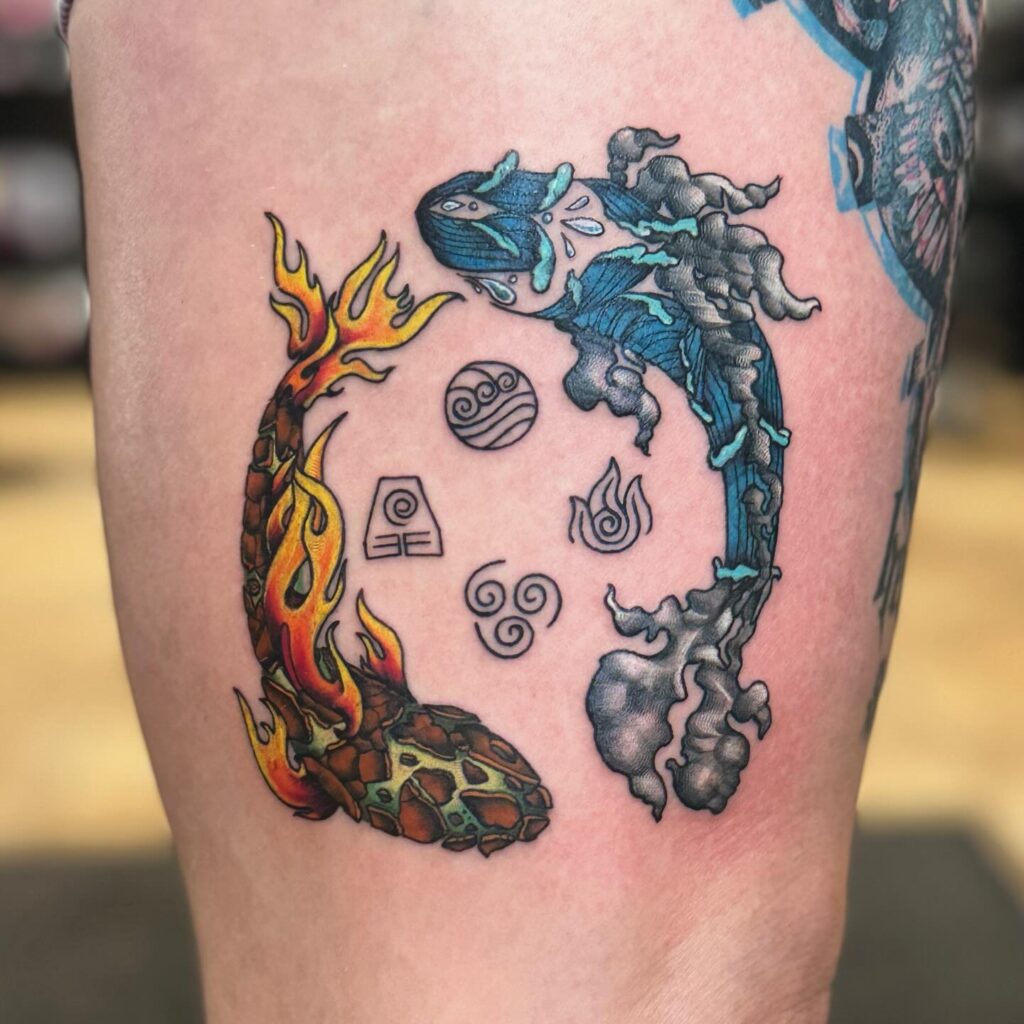 This tattoo combines the Yin Yang symbol with fire and water elements, represented by two opposing koi-like creatures. One side blazes with fiery tones while the other flows with cool blues, emphasizing balance between passion and calm.