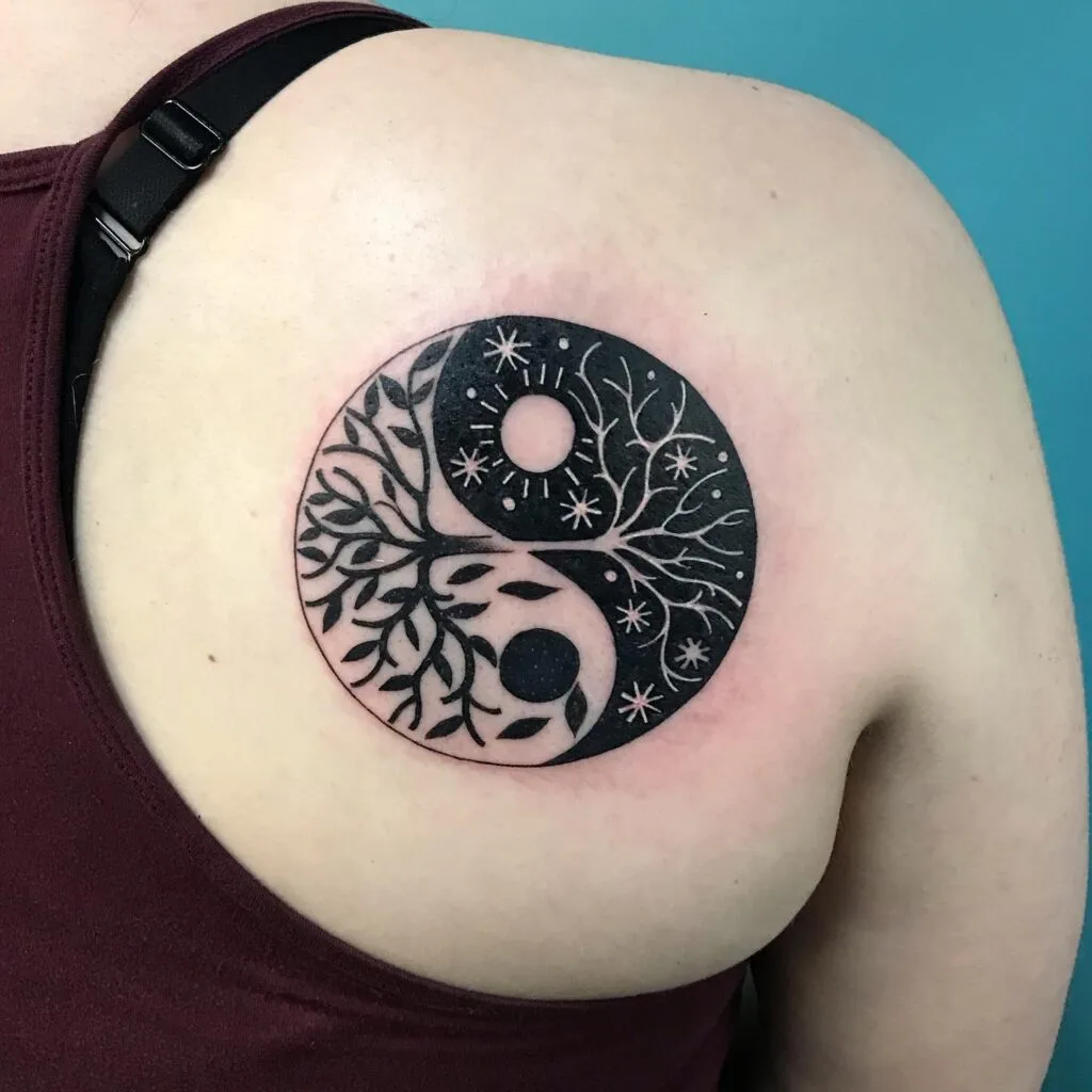 This tattoo beautifully merges the Yin Yang with the Tree of Life, symbolizing growth, renewal, and the balance between light and darkness. The intricate branches and leaves on one side contrast with the celestial stars on the other, creating harmony between earth and sky.