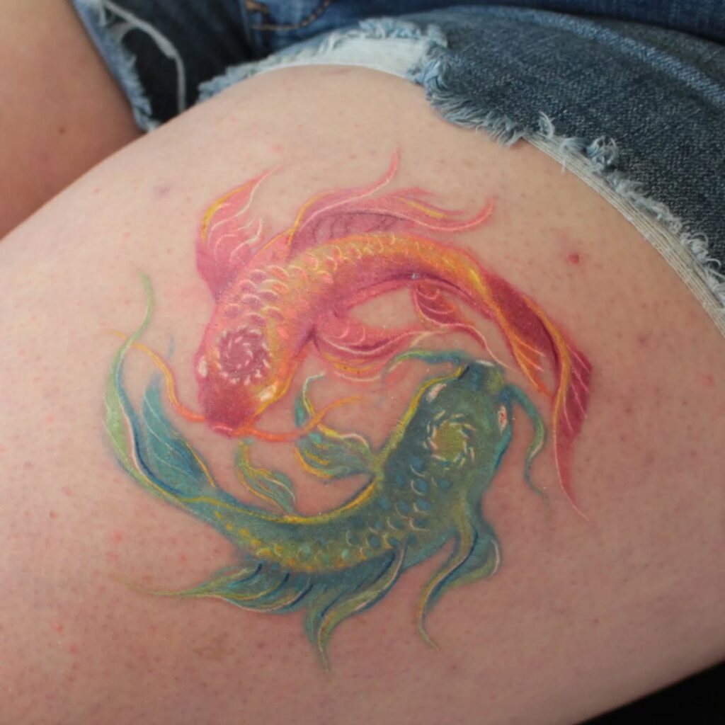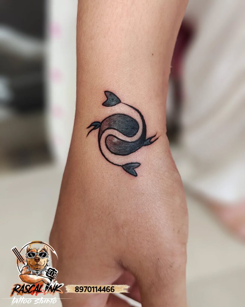 Here, a simple and clean design features two small fish forming a Yin Yang, with minimal detail and soft color accents. Its compact size makes it perfect for wrist or ankle placement.