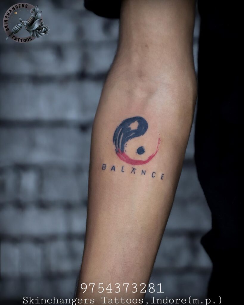 This tattoo uses brushstroke-inspired lines to create a modern Yin Yang, paired with the word “Balance” beneath it. The red accents provide a striking contrast, symbolizing energy and passion.